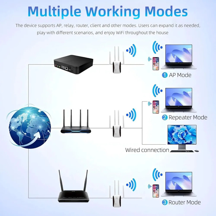 مناسب برای خانههای بزرگ، طبقات متعدد و محیطهای اداری. با خرید ریپیتر وای فای ۱۲۰۰Mbps دوباند چهار آنتن، دیگر نگران قطعی یا ضعف سیگنال در اتاقهای دورافتاده نخواهید بود و از اینترنت پرسرعت در تمام نقاط لذت ببرید.