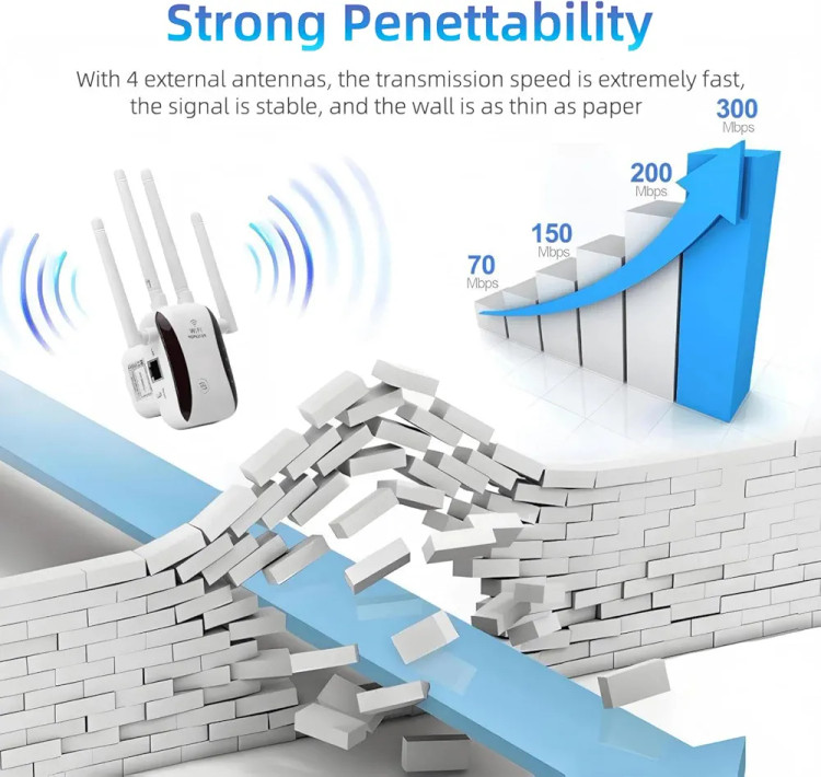 با قابلیت WPS و اتصال یککلیکه، راهاندازی این دستگاه در کمتر از یک دقیقه انجام میشود. چهار آنتن خارجی ۲dBi با قدرت نفوذ بالا در دیوارها، سیگنال ضعیف روتر اصلی را دریافت و چندین برابر تقویت میکند تا پوشش گستردهتری در تمام نقاط خانه داشته باشید.
