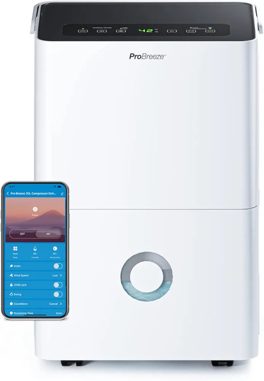 اپلیکیشن هوشمند و پنل کنترل دیجیتال: این دستگاه رطوبتگیر متصل به Pro Breeze به شما امکان میدهد سطح رطوبت محیط را کنترل کنید، سطح رطوبت ایدهآل، تایمر روشن/خاموش 24 ساعته را تنظیم کنید یا یکی از 3 حالت عملکرد (خودکار، رطوبتگیری مداوم و خشک کردن داخلی) را با استفاده از پنل کنترل دیجیتال آسان یا اپلیکیشن هوشمند Pro Breeze انتخاب کنید.