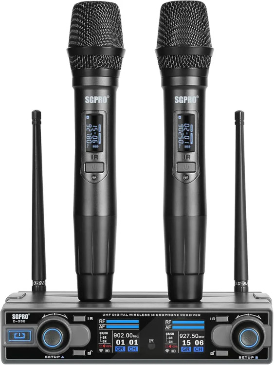 میکروفون بیسیم دستی دوگانه SGPRO D-332 | UHF، برد ۸۰ متر، ۹۰ فرکانس | مناسب هیئت، مداحی، اجرای زنده و کارائوکه